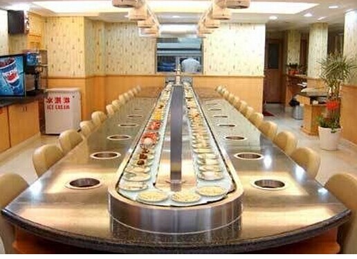回轉壽司設備 回轉火鍋設備是我公司自創(chuàng)開發(fā)的一種新型菜料自動輸送設備,輸送長度可根據客戶的場地造型尺寸定做,輸送鏈板采用304不銹鋼制造,具有美觀、清潔、衛(wèi)生,輸送方向,速度任意可調,是各種自助火鍋,自助早餐的新型時尚的設備。傳動部分采用臺灣產(城邦牌)2hp-1500w變頻減速電機,速比1:100,變頻器采用220v,2hp-1500w.se系列,線速2-8米/分鐘 可調。壽司線,回轉壽司線,回轉火鍋線專為大中小型餐飲連鎖企業(yè)量身定做,適應了飲食界推陳出新,適應了現代人對飲食新奇的追求,必會掀起都市飲食新潮。